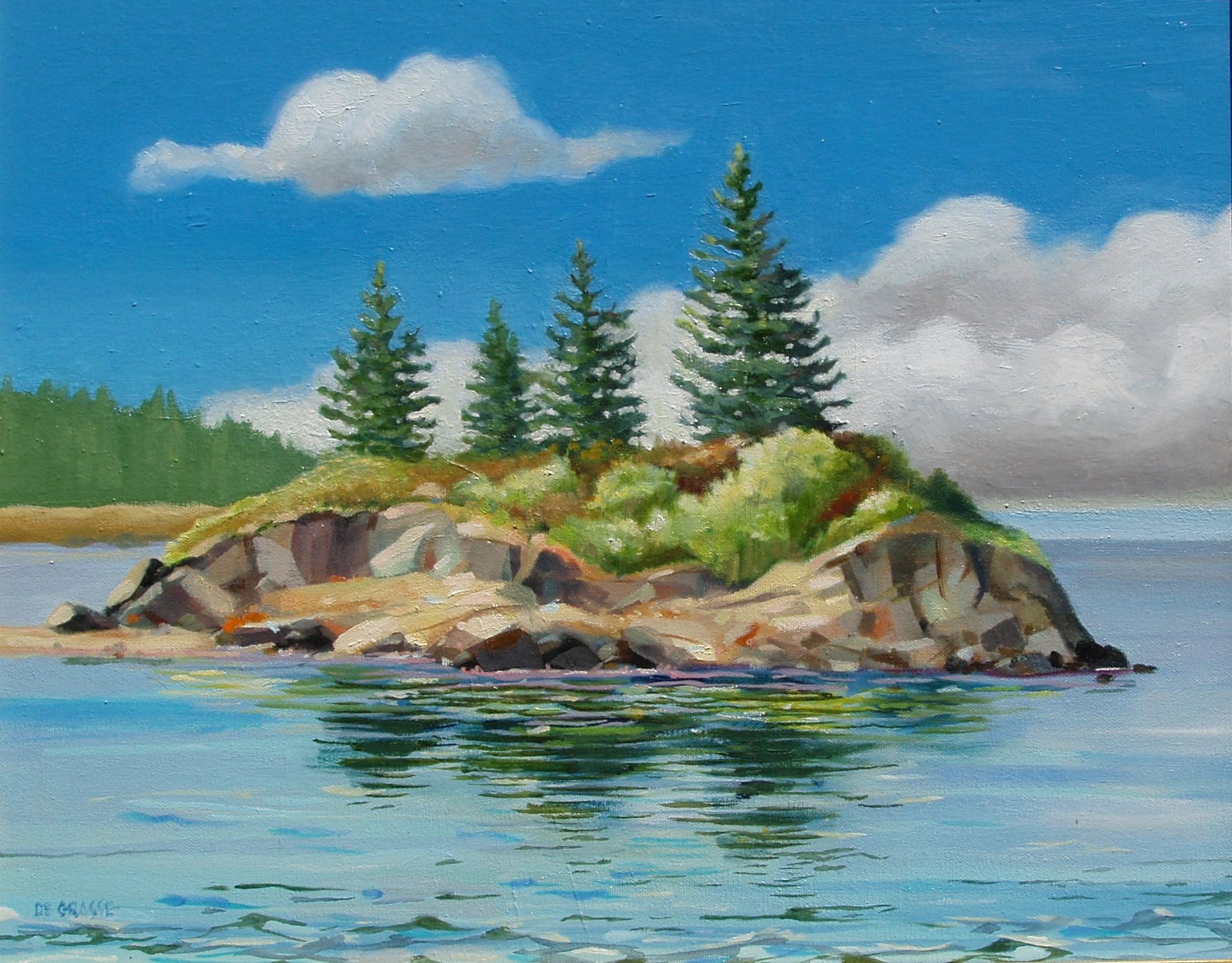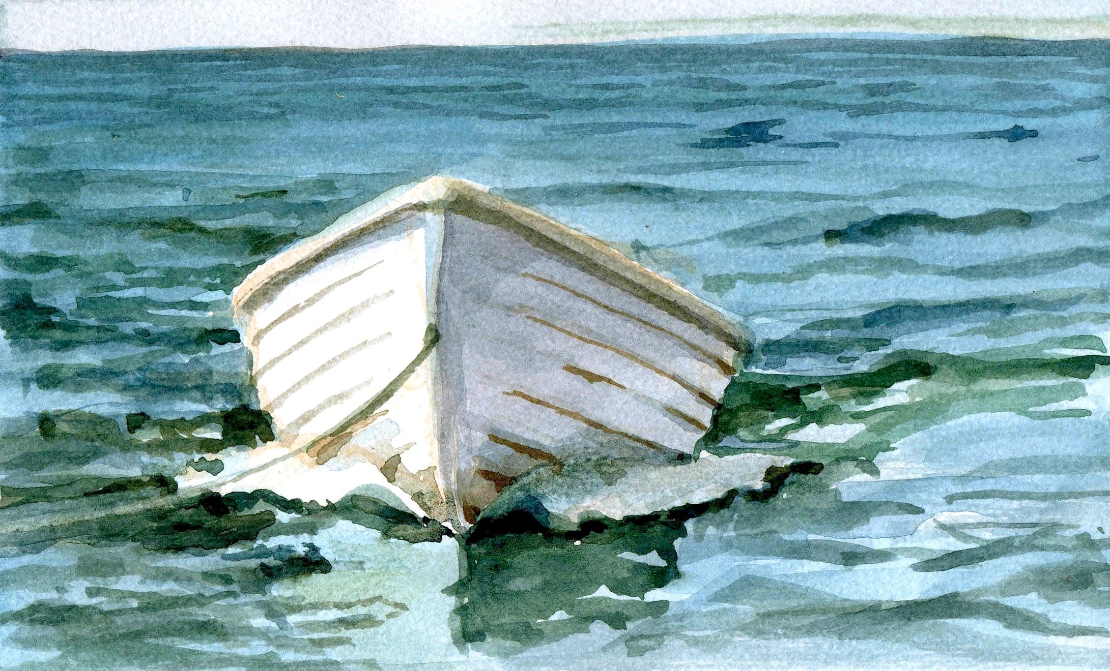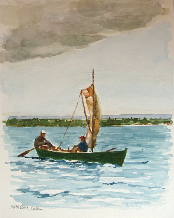Anchored off this small island, I did a small watercolor from the cockpit. The larger oil was painted in the studio.